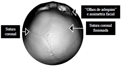 Como a maior parte do volume cerebral da criança é estabelecido por volta de 12-18 meses de vida, quando uma sutura se fecha antes do momento ideal, pode ocorrer alteração no formato craniano. No caso da cranioestenose coronal, ocorre uma restrição do desenvolvimento ósseo anterior e posterior ao lado da sutura fusionada, interferindo no formato supra-orbitário e facial o que confere um aspecto que denominamos “olhos de arlequim” (elevação do teto orbitário, órbita rasa).