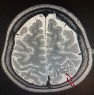 Ressonância magnética de crânio, sequência T2, demonstra lesão displásica cortical